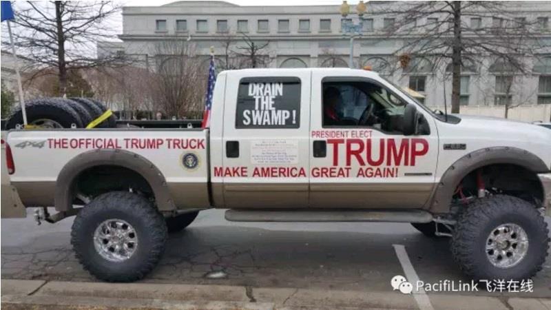 三天之中遇到了不少川粉,真正的草根: 一位来自芝加哥的越南人,没有就职大典的入场券,也不知道可以找自己的国会议员要票,甚至不知道宣誓仪式在哪里举行,但是凌晨5点坐飞机到了华盛顿,说就是想感受一下气氛,哪怕看看热闹也好。 还碰到一位来自加拿大的华人,说美国的走向就是加拿大的未来,这次临时决定来参加就职典礼,旅馆订的很远,每天坐火车去DC一起欢庆。 参加就职典礼的路上看到路边停着这辆皮卡,车主的激情一览无遗: