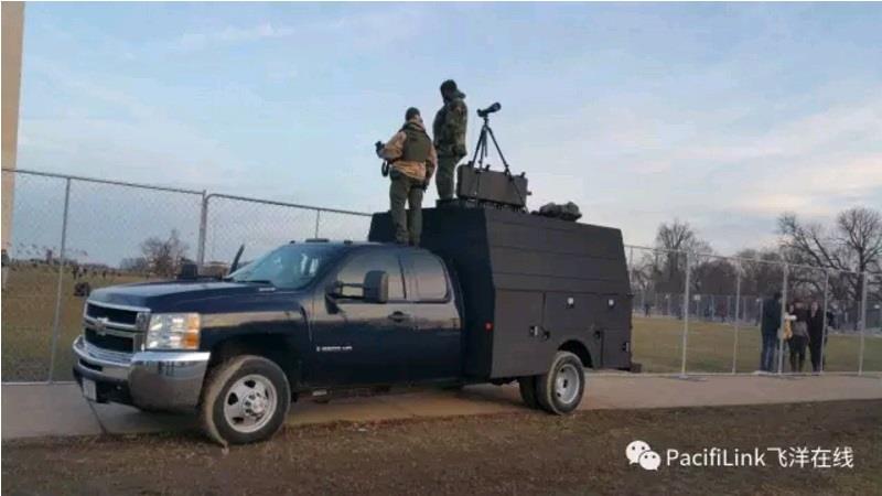 川普音乐会的外围停着这辆车,两个身穿迷彩服的大汉用望远镜遥望舞台,也是一景: