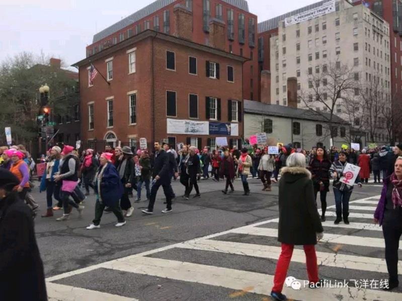 今天是妇女团体组织的反川大游行,以华盛顿DC为中心,全美各大城市呼应。今天去DC的火车上绝大部分是头戴四方小帽的女性,貌似80%左右。DC的主要街道也随处可见。 抗议者以白人占绝大多数,在加州司空见惯的西裔很少看到,黑人也不多,亚裔只见到区区几个人。 另外本以为年轻一代会占大部分,但是粗略观察,似乎中老年人更多,感觉有一半以上。