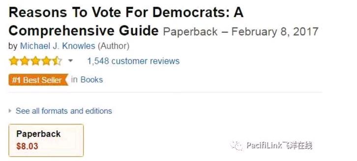 虽然这本书可以10秒读完,读者书评却让人回味无穷: ChesterAAwesome: 如果民主党把这本书的内容复制到党纲里去,他们一定会所向披靡。 Aaron Magana: 这本书读完令人哑口无言。我每晚睡前都要读一遍,每次都有新收获。 Coriolis:从这部史诗般巨著里,我终于找到了内心一直在想,却无法用语言表达的东西。作者抓住了民主党的灵魂。谁能想到一个直男居然有如此深刻的洞察力。(注:民主党一大票仓是同性恋,双性恋,变性人,非男非女,忽男忽女,等等) - Coriolis的书评很长,点赞也最多,充满冷幽默,因此排在第一位,飞洋在线强烈推荐。 debbie:Michael Knowles应该获得普利策奖。有关民主党的,只要你想知道,都在这部书里。 Tncastaway:发人深省,及时,绝对强化了我的信念。真希望NPR上能朗读这部著作(注:NPR是美国国家公共电台,近年来越来越左) Camron Cook:迄今为止对自由派理念最简洁,最准确的描述。有关民权和外交的几章尤其令人信服。这本书把民主党的政策用简单易懂的语言表述出来,令人叹为观止。 Keith Moran:我一直琢磨如何跟我的孩子们解释自由主义的优点。这本书帮了大忙。我两岁的女儿现在找到了她最喜欢的涂鸦本儿。她画的东西很可能成为民主党下一个伟大的福利法案。这才是真正的生命轮回。 亚马逊官网链接:https://www.amazon.com/Reasons-Vote-Democrats-Comprehensive-Guide/dp/1543024971