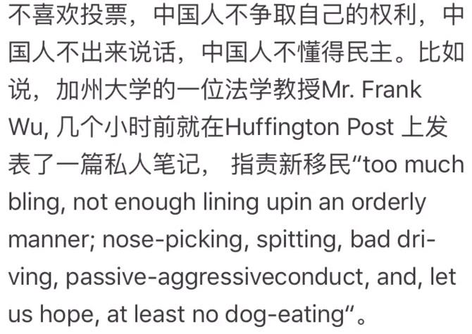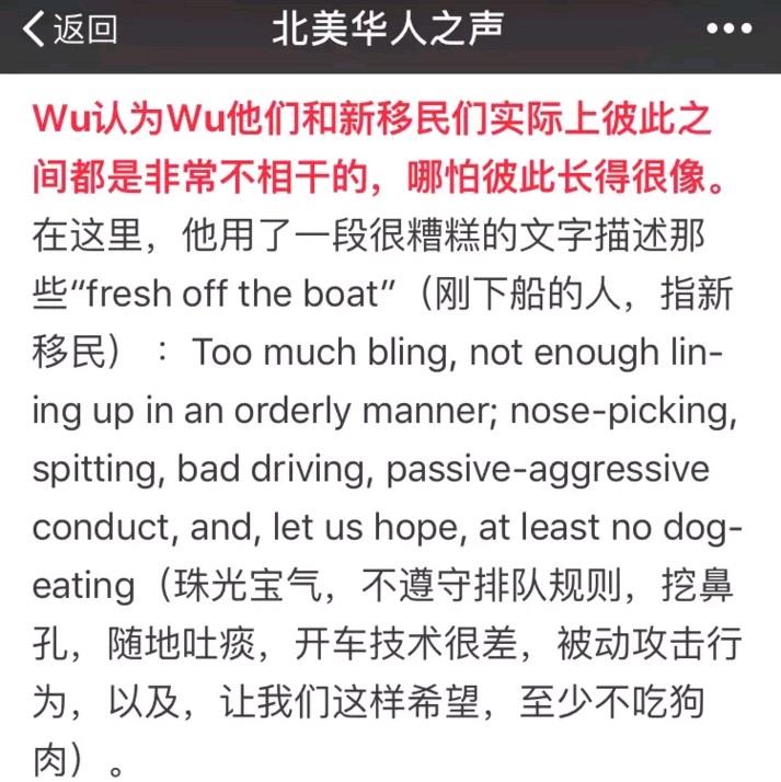 第二段:他指出从亚洲(尤其是中国)新来的移民和他们这些老移民想要的东西不一样。这一点在我们新移民圈里不是秘密,但是显然吴华扬认为他的老移民朋友并没有意识到这一点,所以特别指出。他恳求老移民用尊重的态度倾听新移民的诉求,当然目的是为了让他们说服新移民。他强调他们需要认识到新移民不愿意接受他们的 “指教”,我们受够了,不要把我们当学生来教训。 第三段:他说他在美国各地听到新移民的很多抱怨。 第四段:他发现新移民对那些来得更早的、更归化主流的亚裔非常愤怒。虽然他很犹豫是否应该指出来,但是他担心等待只会恶化形势。 第五段:他指出新移民认为他们这些老移民社会活动家并不代表自己,甚至背叛了自己。 第六段:他说对于老移民来说,新移民 “很亚裔”;而对于新移民,老移民 “很美国”。我们好像都不把对方当自己的族类。 第七段:他说事实上新移民和老移民是有不同的。亚洲正处于上升期,这些新移民和亚洲保持着密切联系,不再像老移民一样简单认为自己是“亚裔”,新移民的定位是多种多样的。 第八段:他说尽管别人说我们长得很像,但是新移民和老移民互相觉得非常陌生。他指出新移民对老移民高高在上的态度非常清楚,尽管老移民不承认。他接下来指出老移民看不起新移民是各个种族都有的现象,尽管 “fresh off the boat” 好像已经是一个流行词了,但是仍然带有贬义。他接下来指出了对新移民的一些常见丑化,也正是这段话激起了 “北美华人之声” 的强烈不满。 第九段:继续叙述了他私下听到的老移民对新移民的不满,并且表示自己并不完全反对。“他们是一群不关心民主的偏执狂。他们觉得自己比其他有色人种优秀。他们有时甚至毫不掩饰自己会超越白人。他们有些人可能照美国标准算很腐败。” 第十段:继续描述包括他自己在内的老移民对新移民的观察:和传统亚裔形象不一样的是,这些新移民会主动出击,而不是觉得自己是弱势群体。从高等教育的AA,到非法移民问题,到同性恋权益,到警察滥用暴力,到体罚,到死刑,新移民和老移民的立场是完全相反的。甚至环保问题,新移民觉得不让吃鱼翅和其他濒危动物是一种迫害。 第十一段:他听到那些以前鼓励亚裔参政的同道抱怨新移民参政,抱怨他们站在老移民的对立面。他说当老移民指出新移民被利用时,新移民会非常愤怒。新移民能感受到老移民的尴尬,但是他们是为了生存而战。人不为己,天诛地灭。 第十二段:他到这里开始总结以及与开头呼应。他提出有两个原因让他相信,老移民必须要拥抱(embrace)新移民。他说老移民和新移民不应该变成 “我们” 和 “他们”,尤其是外人根本分不清老移民和新移民。 第十三段:他指出第一个理由是老移民社会活动家自己的说辞。他说,老移民活动家们常说要联合,要在谈判桌上争取 “一席之地”。如果老移民不能全心全意地迎接那些看起来跟自己一样的新移民,那实在是大错特错。老移民应该给新移民位置,不然就是说一套做一套。如果老移民不让位,就会被挤开。反正老移民自己说,大家都应该有位置。 第十四段:他指出第二个理由是从战略角度。新移民人数比老移民多,而且越来越多。美国大部分亚裔都是移民。如果老移民不能和新移民联合,那么新移民会从数量上超过老移民并且让老移民在政治上变得无关紧要。 第十五段:他指出如果不能让所有亚裔美国人参与进来,老移民需要为运动的失败负责。 第十六段:我们必须联合,别无选择。 解读