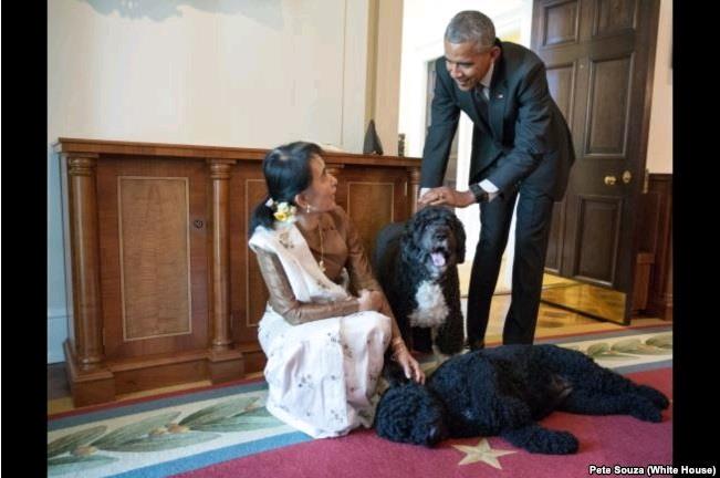 2016年9月4日,缅甸国务资政昂山素季访问白宫,在会见奥巴马总统后,看望奥巴马的两只爱犬,波和桑尼。