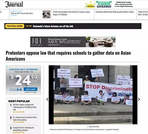 自从去年加州推出亚裔细分法案以来,美国各地华人一直站在抗争的前沿。亚裔细分,是打着“收集资料“的旗号,要把亚裔人口进一步细分,不仅仅影响的是华人子女上大学的比例,同时会让华人未来在就业时,也会受到更多限制和歧视。 因为一旦形成“有先例可循”的惯例,不但入学的时候大陆华人要让路给其他亚裔和其他族裔,工作时大陆华人也要被迫面临“均衡族裔比例”的不公平政策。 想象一下,以后当我们申请工作时,申请信用卡和贷款时,都需要提供十分详细的种族信息,将会是什么场景? 近期,罗德岛州、亚利桑那两周的华人组织了两次大型活动,以对抗日趋严重的亚裔细分活动。 01 | 什么是亚裔细分法案?亚裔细分法源于AB-1726法案,由加州众议员Rob Bonta于2016年1月提出。 法案要求2017年7月1号起,加州公共高等教育系统、医疗系统针对中国人、印度尼西亚人等亚裔和原籍亚太平洋岛国的居民,额外增加附加表格及其他表格,对所在血统族裔详细情况进行登记。在加州细分Asian种族,把印尼人、马来人、泰国人等单独划分。 当时这个法案一公布就引发当地华人,特别是来自大陆地区华人的巨大反对,经过多轮集会、抗议、万人签名请愿等一系列活动,最终在州长布朗(Jerry Brown)的支持下,大幅度修改法案,将此前高等教育方面要求细分亚裔的内容全部删除,另外,实施日期也从原定的2017年延后至2022年,而且须在财政许可的情况下才能实施,还去除了地方实施项目。 继加州之后,罗德岛州、纽约州、亚利桑那等州都先后出现了亚裔细分法案抬头的趋势。 亚裔细分可以说是为了特别把大陆来的华人与其他亚裔群体区分出来。此立法中细分的目的是要照顾像柬埔寨、老挝、菲律宾这样的小族裔,以及美国传统盟友日本、韩国的利益。如果细分成功,那么来自大陆来的华人在上大学与找工作方面就无法避免地遭到歧视。 说到亚裔细分,就不得不提到美国的“平权运动”。 平权运动(Affirmative Action)是在美国上世纪60年代的民权运动和相关法案之后,由数个总统前后签订的总统执行令里提出的。顾名思义,“affirmative action” 的本意就是为了保障公民权利平等的“坚决措施”。在那个时代,由于根深蒂固的种族偏见存在,这个坚决措施对消除种族歧视、推广种族平等应该还是起了正面作用的。所以它也被称为“平权法案”。 但是随着时间的流逝,平权法案被一些有私心的政客所利用,成为少部分人“越权获利”的一颗棋子。特别是美国上届政府,在所有场合都宣称支持以种族优待为实的平权运动,并以实际行动推行种族优待,种族配额。 事实上平权没有错,平权就是机会平等,而歧视和优待都不是平权。可悲的是,如今平权的运动往往变成了以平权之名,行种族优待之实,而这恰恰是平权要反对的。 如今遭到华人反对的亚裔细分法案就是一个例子。 02 | 罗德岛抗议初战告捷亚利桑那谈判传捷报7月20日罗德岛州参加当地华人组织的反对亚裔细分法的抗议示威集会,这是罗德岛州的华人第一次组织这种活动。当地很多华人挺身而出,无私奉献。从申请集会 permit,到准备给州长的 petition,到挨家挨户拉人参与,到自费准备各种标语,横幅与国旗,花费了大量的时间,金钱与精力。 但他们的努力没有白费,此次集会已引起当地主流媒体的重视,参与集会的布朗大学的吴教授还接受了当地电视台的专访,把华人的诉求,反对亚裔细分的原因告诉其他美国民众。