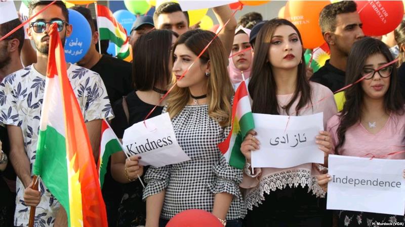 一些学生说,他们独立建国的梦想压倒了独立公投可能让库尔德自治区孤立的恐惧 (2017年9月29日) 埃尔比勒 — 伊拉克政府对往返库尔德自治区国际航班的禁飞令星期五开始生效。数百名抗议者聚集在机场外,挥舞着各色气球和写着“慈悲”和“爱心”的标语。 抗议者说,他们希望伊拉克政府能收回在库尔德自治区实施禁飞令的决定。此前,该地区举行了颇具争议的独立公投,公投结果显示,92%以上的民众支持独立。 这次抗议活动的组织者侯赛因说:“禁飞令不仅影响到库尔德人,也会影响到难民,流离失所的家庭,和所有打击伊斯兰国激进分子的武装力量。” 伊拉克政府认为这次公投不合法,宣称一定要迫使库尔德自治区留在伊拉克。伊拉克总理阿巴迪在推特上说,法国、英国、伊朗和土耳其领导人近日来都打电话给他,表达对伊拉克领土完整的支持。 库尔德自治区独立公投的一天后,阿巴迪在推特上写道:“我们不会在伊拉克完整或主权上做出妥协。伊拉克很坚强,有些人想削弱伊拉克,他们打错了算盘。” 除了禁止国际航班往返外,伊拉克政府还下令库尔德自治区将边界控制权和石油收入交给联邦当局。库尔德自治区领导人也毫不退让,要求谈判协商库尔德自治区向独立国家过渡。