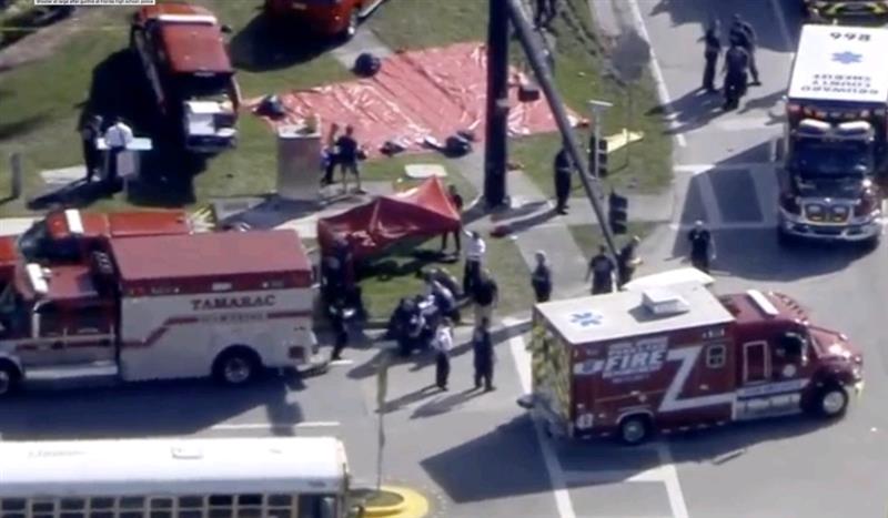 美国佛罗里达州布劳沃德郡发生高中枪击后紧急救援人员赶到现场