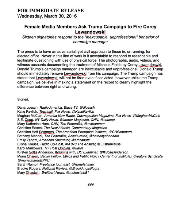 “Never in this line of work is it acceptable to respond to reasonable and legitimate questioning with the use of physical force,” the statement reads. “The photographs, audio, videos, and witness accounts documenting the treatment of Michelle Fields by Corey Lewandowski, Donald Trump’s campaign manager, are inexcusable and unprofessional. Donald Trump should immediately remove Lewandowski from his campaign.”