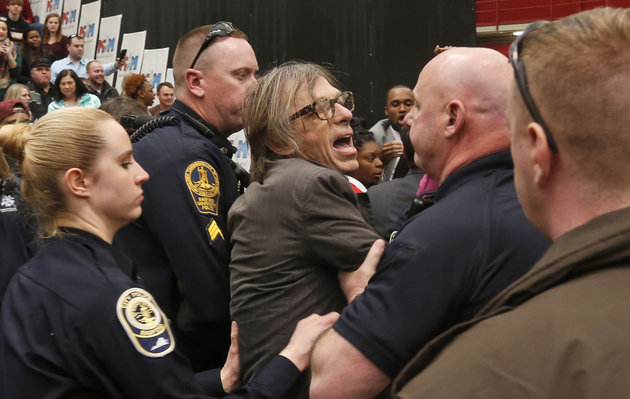 The next month, a Sikh protester was physically pushed out of a Trump rally in Iowa, while fans yelled, "Trump! Trump! Trump!" The protester described it later as "a fascist rally in a school gym." Last week, yet another video emerged of grown men at an event in Kentucky forcibly shoving a young black woman.